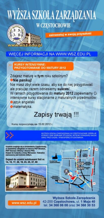 Wyższa Szkoła Zarządzania w Częstochowie zaprasza na kursy specjalnie organizowane dla maturzystów. Kursy rozpoczynają sie 15.02.2012 r.