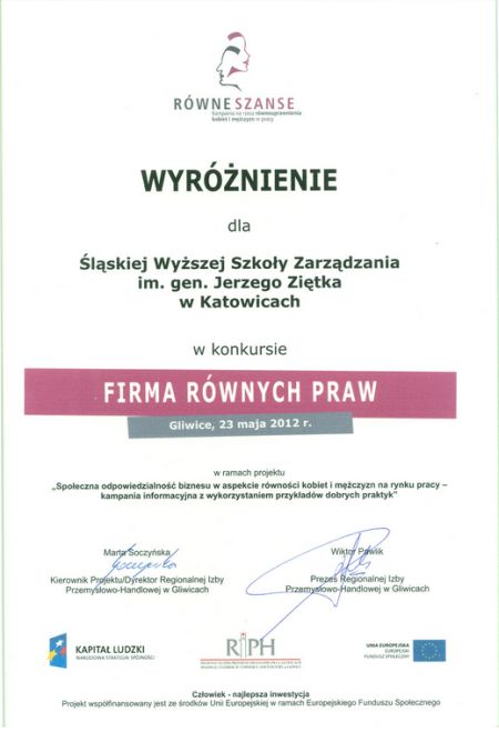 23 maja 2012 roku Śląska Wyższa Szkoła Zarządzania im. Gen. Jerzego Ziętka w Katowicach otrzymała wyróżnienie w konkursie "FIRMA RÓWNYCH PRAW"