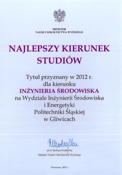 W dniu 12.07.2012r. w Kancelarii Prezesa Rady Ministrów odbyła się uroczystość wręczenia dyplomów najlepszym kierunkom wszystkich rodzajów studiów w Polsce. Poniżej dyplom dla kierunku Inżynieria Środowiska: