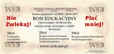 Wystarczy przyjść do biura rekrutacji z kompletem dokumentów do 28 lutego 2013 wraz z bonem (PDF). Dzięki temu można zyskać stałą bonifikatę, dzięki której można znacznie zaoszczędzić.