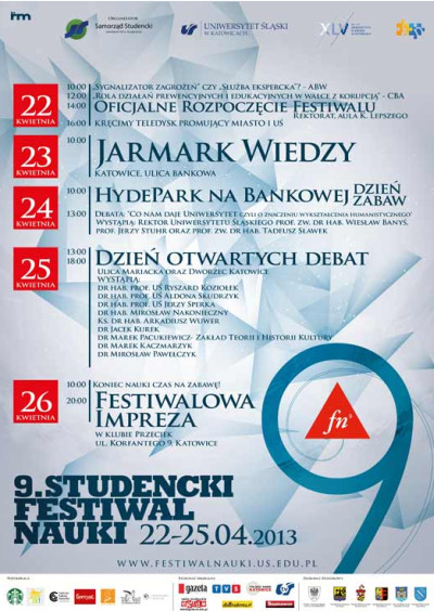 Od 22 do 25 kwietnia 2013 r. odbywa się 9. Studencki Festiwal Nauki. Jest to niepowtarzalna okazja do odwiedzenia miejsc, które na co dzień są niedostępne dla osób niezwiązanych ze środowiskiem akademickim. Dziś o godz. 10.00 rozpocznie się Jarmark Wiedzy. Na deptaku przy ulicy Bankowej powstanie miasteczko namiotowe, w którym studenci przygotują szereg atrakcji. Przedstawiciele kół naukowych pokażą jak przeżyć przygodę z nauką.