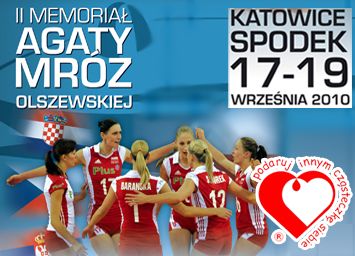 W dniach 17 – 19 września w katowickim „Spodku”, już po raz drugi odbędzie się Memoriał Agaty Mróz – Olszewskiej. Impreza, która nie tylko upamiętnia jedną z najwybitniejszych polskich siatkarek, ale przede wszystkim angażuje się w propagowanie bezcennych wartości dla ludzkiego życia. Honorowy Patronat nad imprezą objęły: Anna Komorowska, Jolanta Kwaśniewska, Danuta Wałęsa.