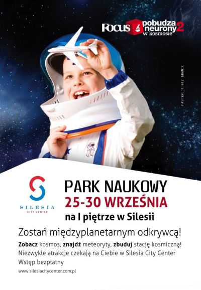 Już od wtorku w Silesia City Center stanie gigantyczny park naukowy przygotowany przez miesięcznik Focus, a wszystko w ramach II edycji akcji „Focus pobudza neurony w kosmosie”. W parku zbudowane zostanie m.in. planetarium – specjalny namiot sferyczny, w którym odbywać się będą pokazy filmów o tematyce astrofizycznej. Natomiast przyszli astrofizycy będą mogli z bliska przyjrzeć się interaktywnemu Układowi Słonecznemu. Olbrzymi model będzie pokazywał m.in. zjawiska zachodzące w kosmosie, fazy księżyca, pory roku, zaćmienia i długość cienia. Natomiast w strefie meteorytów dzięki prawdziwym detektorom metalu będzie można poszukać pozostałości planetoid znajdujących się pod ziemią.