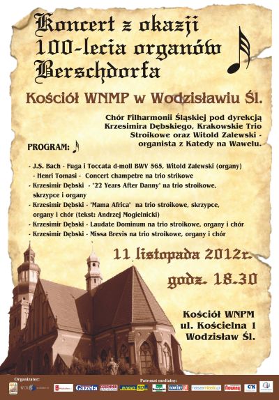 Parafia Wniebowzięcia Najświętszej Marii Panny w Wodzisławiu Śląskim oraz Wodzisławskie Centrum Kultury serdecznie zapraszają na wyjątkowe wydarzenie UROCZYSTY KONCERT Z OKAZJI 100-LECIA ORGANÓW. Kościół Wniebowzięcia Najświętszej Marii Panny w Wodzisławiu Śląskim. 11 listopada 2012 r. godz. 18.30. Podczas koncertu wystąpi Chór Filharmonii Śląskiej pod dyrekcją Krzesimira Dębskiego, Krakowskie Trio Strikowe oraz Witold Zalewski - organista z Katedy na Wawelu.