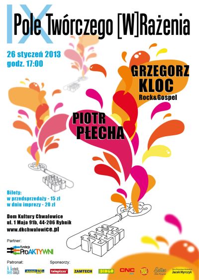 Zapraszamy na kolejną edycję Festiwalu Pole Twórczego (W)Rażenia w dniu 26 stycznia (sobota) 2013 r. o godz. 17.00, wystąpią: Grzegorz Kloc Rock&Gospel Project i Piotr Płecha. Bilety w cenach: 15 zł (w przedsprzedaży) i 20 zł w dniu imprezy.