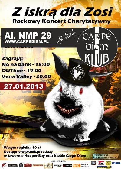 Z iskrą dla Zosi: rockowy koncert charytatywny zespołów: Vena Valley, Outline oraz No Na Bank. 27 stycznia, niedziela, godz. 18.00. Wejściówka-cegiełka 10zł. Kraków, klub Carpe Diem.