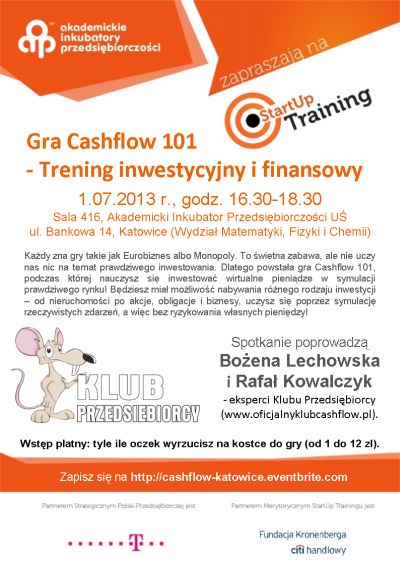 Akademickie Inkubatory Przedsiębiorczości serdecznie zapraszają na nietypowy StartUp Training, na którym poprzez zabawę nauczysz się jak skutecznie inwestować pieniądze. Gra Cashflow odbędzie się 1 lipca 2013 r. w godz. 16.30-18.30 (Akademicki Inkubator Przedsiębiorczości UŚ, ul. Bankowa 14, Katowice, sala 416).
