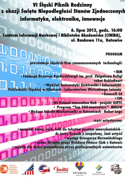 W sobotę 6 lipca 2013 r. o godz. 16.00 w Centrum Informacji Naukowej i Bibliotece Akademickiej (Katowice, ul. Bankowa 11a) odbędzie się VI Śląski Piknik Rodzinny z okazji Święta Niepodległości Stanów Zjednoczonych. Wydarzenie będzie odbywać się pod hasłem: informatyka, elektronika, innowacje. W programie przewidziano m.in. prezentacje śląskich firm i instytucji zajmujących się zaawansowanymi technologiami, a także koncerty, pokaz fit-lajfu oraz zajęcia dla dzieci. Wstęp wolny.
