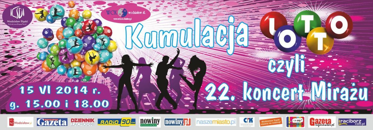 Serdecznie zapraszamy wszystkich spragnionych tanecznych wrażeń na premierowy koncert zespołu Miraż, działającego przy Wodzisławskim Centrum Kultury. Koncert pn. „Kumulacja LOTTO, czyli 22. koncert Mirażu” odbędzie się 15 czerwca o godzinie 15.00 oraz 18.00