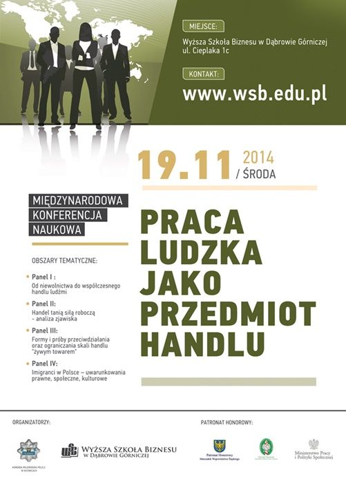 Wyższa Szkoła Biznesu w Dąbrowie Górniczej wraz z Komendą Wojewódzką Policji w Katowicach zaprasza na Międzynarodową Konferencję Naukową "Praca ludzka jako przedmiot handlu".