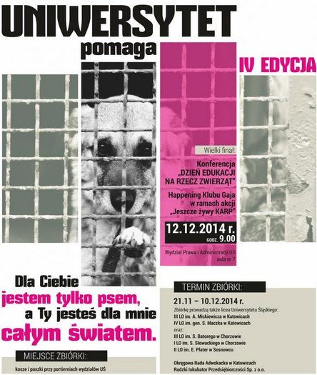 Między 21 listopada a 10 grudnia 2014 r. odbędzie się zbiórka na rzecz zwierząt w ramach IV edycji akcji „Uniwersytet Pomaga”. W tych dniach przy portierniach wydziałów i jednostek dydaktycznych Uniwersytetu Śląskiego, w Centrum Informacji Naukowej i Bibliotece Akademickiej oraz w Wydawnictwie Uniwersytetu Śląskiego udostępnione będą puszki kwestarskie i kosze na dary.