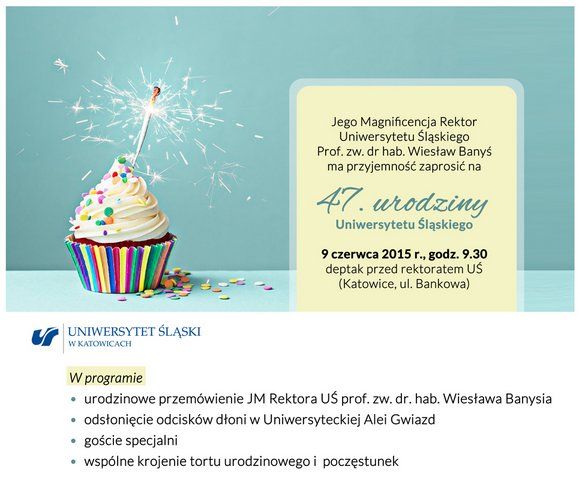 9 czerwca 2015 r. o godz. 9.30 na deptaku przed rektoratem UŚ odbędą się obchody 47. urodzin Uniwersytetu Śląskiego. Podczas spotkania przemówienie okolicznościowe wygłosi JM Rektor Uniwersytetu Śląskiego prof. zw. dr hab. Wiesław Banyś.