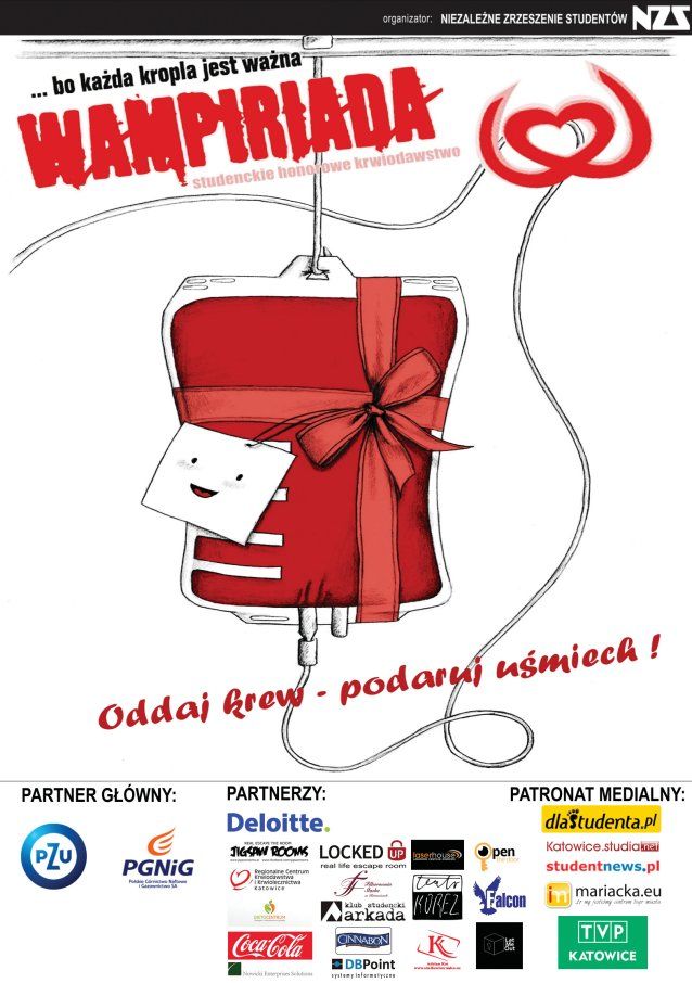 Oddanie krwi nic nie kosztuje, a dla potrzebujących może być bezcennym darem życia. Właśnie dlatego Niezależne Zrzeszenie Studentów Uniwersytetu Ekonomicznego w Katowicach zachęca nie tylko studentów, aby podzielić się swoją krwią podczas kolejnej edycji Wampiriady .