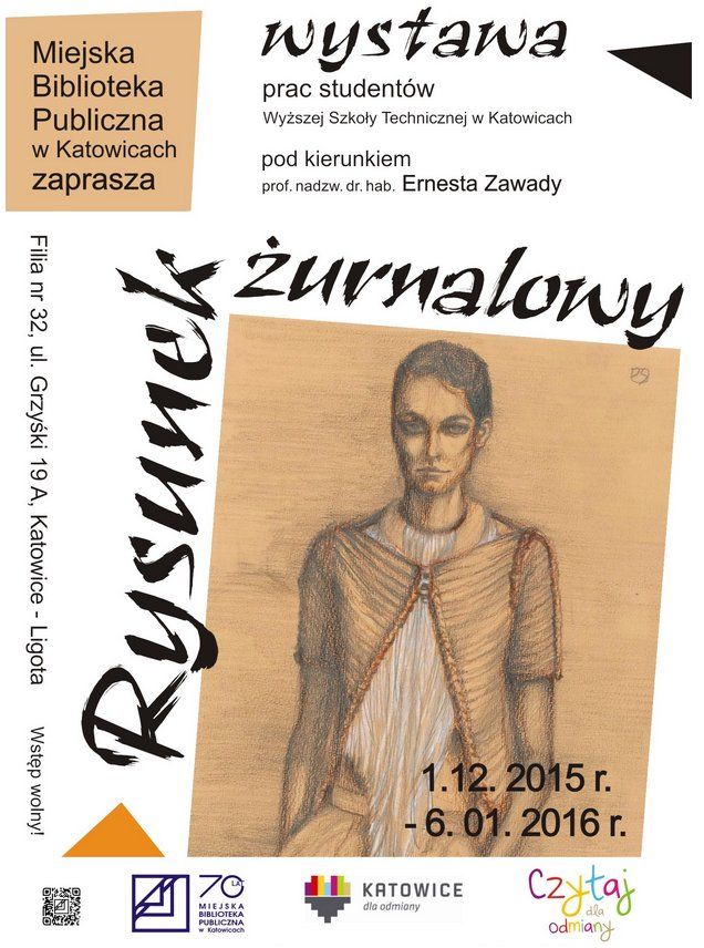 Miejska Biblioteka Publiczna w Katowicach, Filia nr 32 ul. Grzyśki 19 A zaprasza na wystawę prac studentów Wyższej Szkoły Technicznej w Katowicach pt. Rysunek Żurnalowy. Wystawa czynna od 1 grudnia 2015 do 6 stycznia 2016 roku.