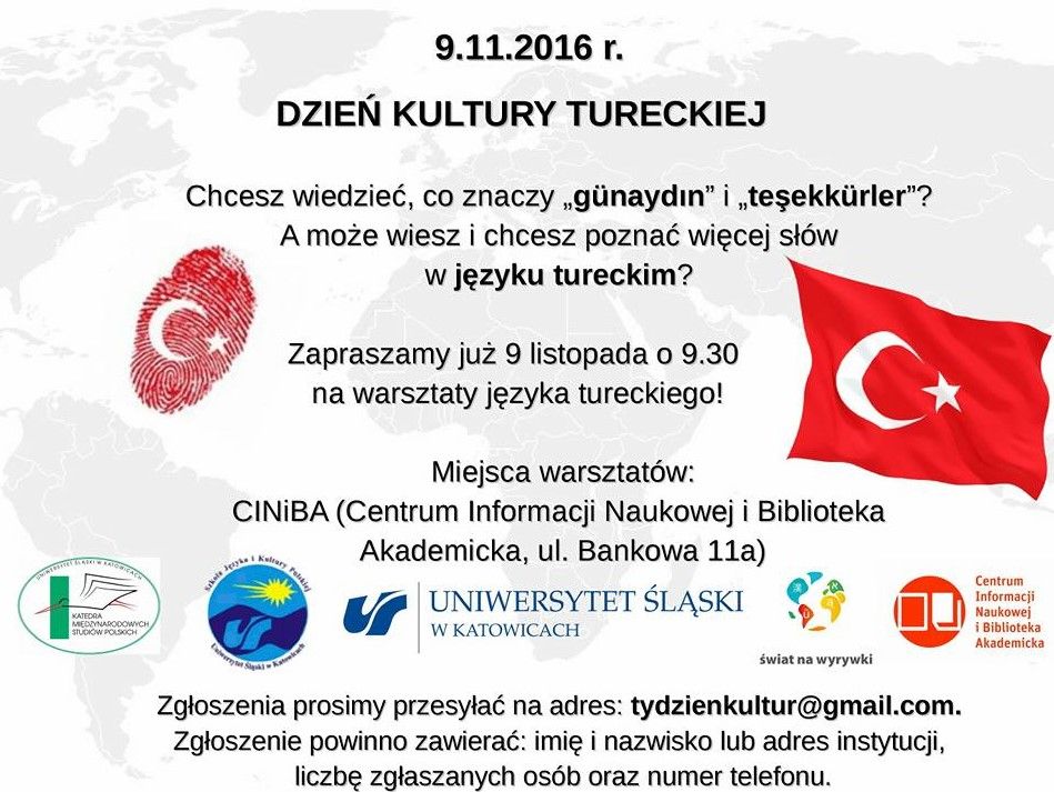 Uniwersytet Śląski organizuje Dzień Kultury Tureckiej, który odbędzie się 9 listopada w Centrum Informacji Naukowej i Bibliotece Akademickiej przy ul. Bankowej 11a w Katowicach. Początek o godzinie 9:30.