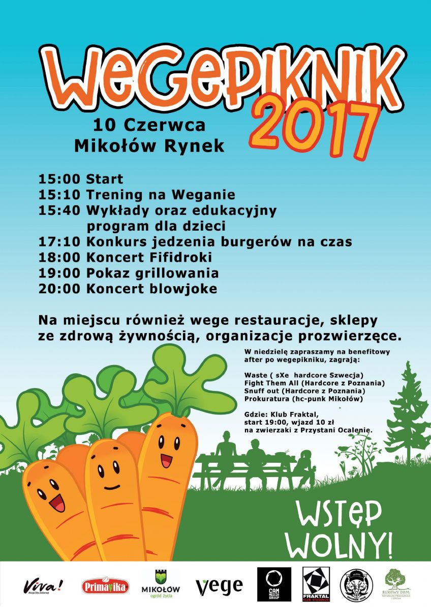 Wegepiknik to doskonała okazja żeby poznać, bądź zgłębić tajniki wegetarian, wegan. To też okazja do wspólnego spędzenia czasu w doskonałej rodzinnej atmosferze. Start już w sobotę 10 czerwca o godzinie 15:00 na Mikołowskim Rynku. Przekaz Wegepikniku to nie tylko "zielone jedzenie". Porusza on tematy ważne społecznie, dotyczące ekologii. Zwraca uwagę na aspekty pro-zwierzęce. Dlatego też wśród atrakcji znalazły się: Trening na Weganie, wykłady oraz ciekawy, edukacyjny program dla dzieci, a także pokaz grillowania. Czas umilą nam koncerty zespołów: Fifidroki i Blojoke. Wegepiknik to oprócz edukacji również doskonała zabawa. O godzinie 17.10 zorganizowany zostanie konkurs jedzenia burgerów na czas - będzie smacznie i zdrowo. 11 czerwca Wegepiknik przenosi się do Mikołowskiego Klubu Studenckiego Fraktal, gdzie za symboliczne 10,00 zł (pieniądze w całości przekazywane na rzecz zwierzaków z Przystani Ocalenie) już od 19:00 można będzie posłuchać Waste (sXe hardcore Szwecja), Fight Them All (Hardcore z Poznania), Snuff out (Hardcore z Poznania) i Prokuratura (hc-punk Mikołów).