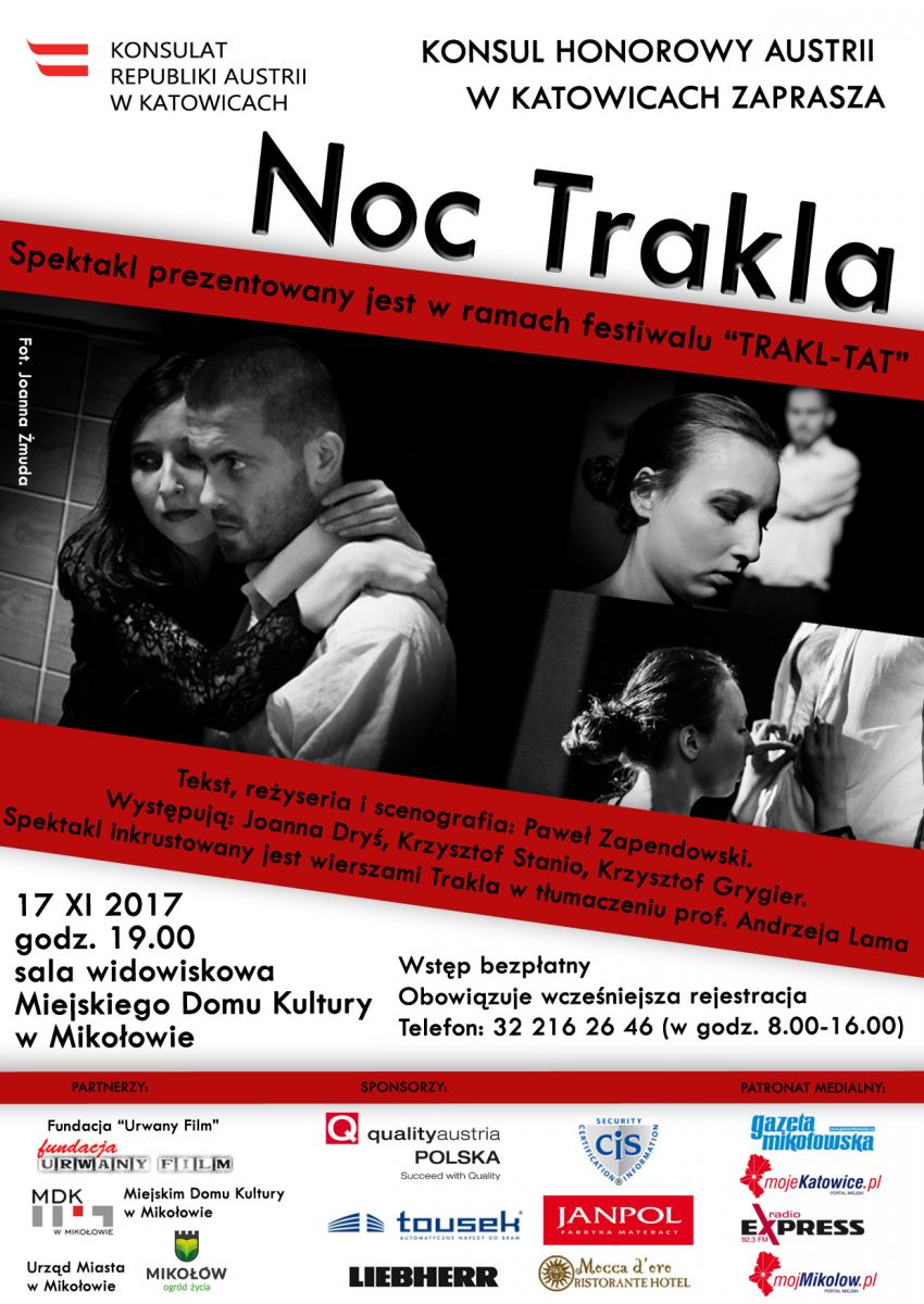 Kraków, początek I wojny światowej, szpital, miłość, tragiczna śmierć. To nie scenariusz nowego filmu, tylko skrawki biografii austriackiego poety. 17 listopada o godz: 19:00 w Miejskim Domu Kultury w Mikołowie na podstawie wierszy i życia Georga Trakla odbędzie się sztuka pt. „Noc Trakla”. Spektakl jest częścią obchodów Dni Austrii w województwie śląskim. Inicjatorem wydarzenia jest Konsul Republiki Austrii w Katowicach Mirosław Bienioszek.