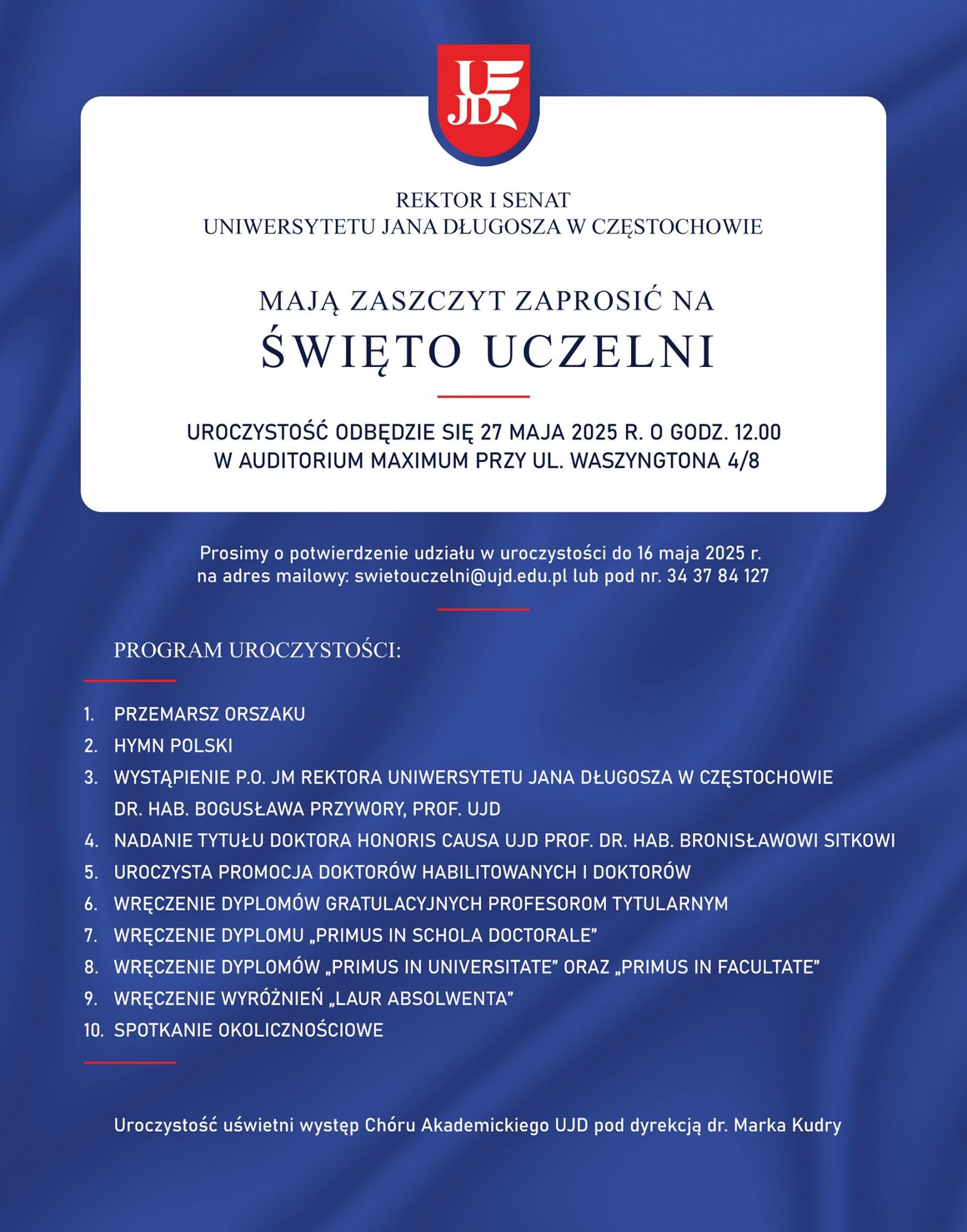 Organizatorzy informują, że podczas obchodów (27.05.2025) będzie realizowana transmisja, fotorelacje oraz zapisy filmowe, które mogą być wykorzystywane w materiałach promocyjnych uczelni (strona internetowa, media społecznościowe). Uczestnictwo w wydarzeniu oznacza zgodę na przetwarzanie wizerunku w powyższym celu. Szczegółowe informacje o przetwarzaniu danych osobowych dostępne są w Polityce prywatności UJD: https://www.ujd.edu.pl/pl/polityka-prywatnosci.