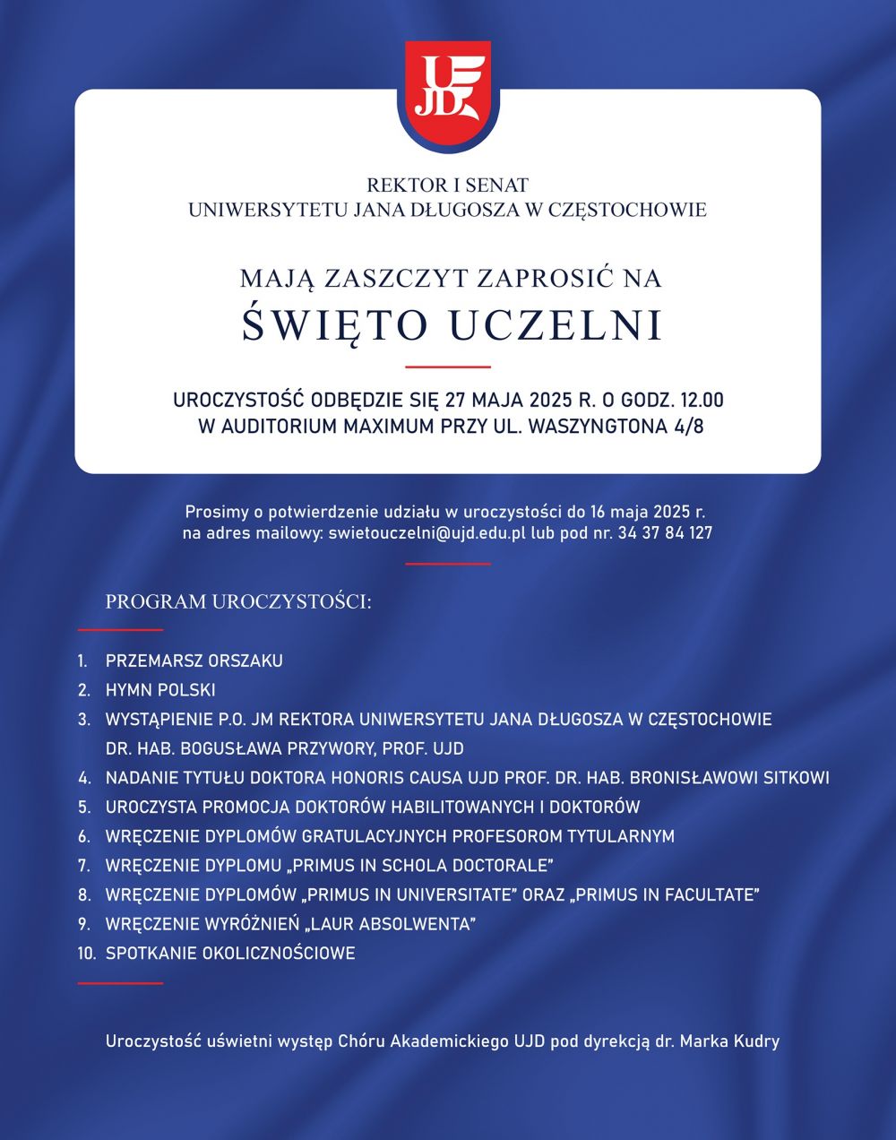 Uniwersytet Jana Długosza w Częstochowie zaplanował na 27 maja o godzinie 12:00 w gmachu Auditorium Maximum (ul. Waszyngtona 4/8) uroczyste obchody Święta Uczelni. Wydarzenie zgromadzi społeczność akademicką oraz przyjaciół uczelni, a jego program przewiduje szereg ceremonialnych punktów podkreślających rangę instytucji i jej osiągnięć naukowych.