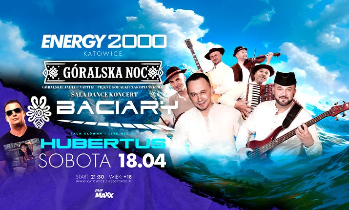 W sobotę 18.04 zapraszamy wszystkich wielbicieli dobrej góralskiej biesiady na drugą edycję imprezy GÓRALSKA NOC w Energy 2000 Katowice. Podczas tego szczególnego wydarzenia czekają na Was specjalnie przygotowane atrakcje: SEKSOWNE GÓRALKI, POCZĘSTUNEK, GÓRALSKIE NAPITKI, UPOMINKI, ZAKOPIAŃSKI BIAŁY MIŚ. A to nie wszystko... wisienką na torcie będzie koncert na sali DANCE – wystąpią BACIARY! Twórcy hitów: „Jak się bawią ludzie”, „Zostań na zawsze”, „Ja Cię kocham”, „Żyje się raz”, „Siedem Czerwonych Róż” i wielu innych przebojów, które zna cała Polska! Na sali głównej zagra dla Was nasz rezydent Dj Hubertus. Znacie go z legendarnej serii ENERGY MIXów!