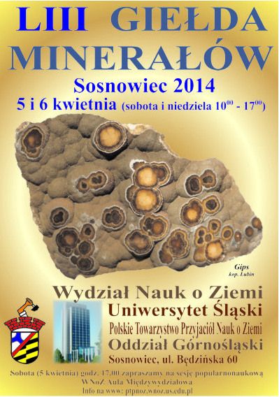 5 i 6 kwietnia 2014 r. od godz. 10.00 do 17.00 na Wydziale Nauk o Ziemi Uniwersytetu Śląskiego odbywać się będzie pięćdziesiąta trzecia giełda minerałów. Do Sosnowca przyjadą wystawcy, kolekcjonerzy i sympatycy gemmologii, mineralogii i paleontologii. Na giełdzie można będzie podziwiać unikalne kolekcje różnych grup minerałów, skał, a także meteorytów i skamieniałości. Wystawcy zaprezentują minerały i wyroby biżuteryjne pochodzące z różnych części świata.