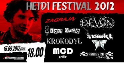 15.09.2012, sobota, godz: 18:00, HEIDI FESTIVAL. Koncert – memoriał dla Damiana „Heidiego” Wrońskiego. Bilety: 10 zł. Sprzedaż biletów: - Klub Wiatrak: rezerwacje/ zakup online: oraz w dniu koncertu. Dochód z imprezy przeznaczony zostanie dla dzieci – podopiecznych zabrzańskiego stowarzyszenia Wielka Flota Zjednoczonych Sił. Wystąpią: SPRENGSTOFF + SZOGUN, KROKODYL, LOST GRACE, MCD estilo, INSEKT, DEVON.