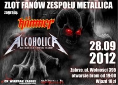 CK WIATRAK 28.09.2012, piątek, godz: 19:00, ZLOT FANÓW ZESPOŁU METALLICA KONCERT: HAMMER, ALCOHOLICA. 23 ZLOT FANÓW ZESPOŁU METALLICA ORGANIZATOR: OFICJALNY FANKLUB ZESPOŁU METALLICA W POLSCE - OVERKILL.PL www.overkill.pl. OTWARCIE BRAM: 19:00 WSTĘP: 10 ZŁ PRZEDSPRZEDAŻ / 15 ZŁ W DNIU KONCERTU ZAGRAJĄ: Koło 20:00 HAMMER www.hammer-official.com. ZESPÓŁ BEDZIĘ KRECIŁ DVD KONCERTOWE Z OKAZJI POWROTU NA SCENE. Z ZEBRANEGO MATERIAŁU POWSTANIE TELEDYSK. PO 21:00 ALCOHOLICA - METALLICA TRIBUTE BAND BLISKO 3 GODZINNY KONCERT Z MUZYKĄ ZESPOŁU METALLICA www.alcoholica.pl. TRADYCYJNIE NA KONCERCIE DO ROZDANIA GARŚĆ GADZETÓW :)