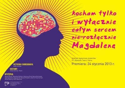 Taneczny spektakl dyplomowy studentów IV roku Wydziału Teatru Tańca w Bytomiu , PWST im. L. Solskiego w Krakowie. pt. "Kocham tylko i wyłącznie całym sercem nie-rozłącznie Magdalenę". Premiera: 24.01.2013, godz. 18.00. Wydział Teatru Tańca w Bytomiu, ul. Piłsudskiego 24a. Bilety 8zł.