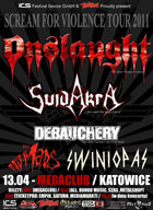 13 kwietnia 2011 zawita do Polski, dokładnie do katowickiego Megaclubu, w ramach trasy "Screaming for Violence Tour 2011" brytyjska legenda thrash metalu - Onslaught, promujący nowy album „Sounds of Violence.” Wraz z nim na scenie pojawią się niemieckie Suidakra i Debauchery oraz śląskie zespoły The No-Mads i Świniopas.