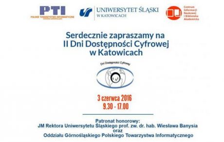 W piątek 3 czerwca 2016 roku w Centrum Informacji Naukowej i Bibliotece Akademickiej (Katowice, ul. Bankowa 11a) odbędą się II Dni Dostępności Cyfrowej, których celem jest przybliżenie tematyki włączenia cyfrowego w aspektach społeczno-technologicznych. Spotkanie skierowane jest w szczególności do osób odpowiedzialnych za dostępność i użyteczność informacji przekazywanej przez władze publiczne, III sektor oraz podmioty gospodarcze.
