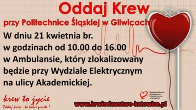 Zbiórka krwi odbędzie się 21 kwietnia 2015 roku w godzinach 10:00-16:00. Ambulans będzie zaparkowany przed Wydziałem Elektrycznym Politechniki Śląskiej przy ul. Krzywoustego 2 w Gliwicach.
