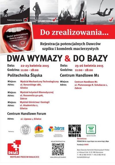 Przyjdź do Politechniki Śląskiej i zostań potencjalnym dawcą szpiku. Akacja odbędzie się w dniach 22-23 kwietnia na Wydziałach: Mechanicznym Technologicznym oraz Górnictwa i Geologii w Gliwicach oraz na Wydziale Inżynierii Biomedycznej w Zabrzu.