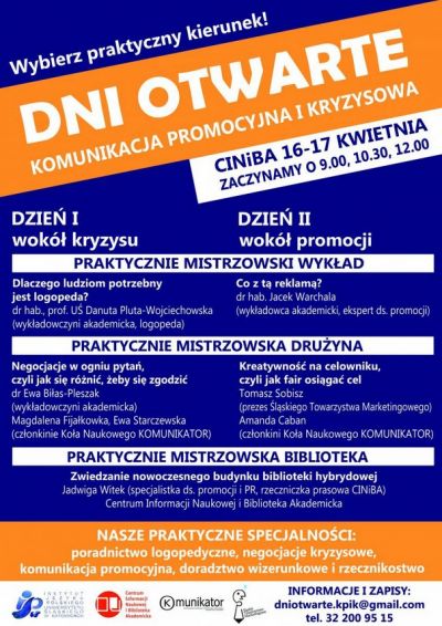 Dni otwarte kierunku Komunikacja Promocyjna i Kryzysowa odbędą się 16 i 17 kwietnia w Centrum Informacji Naukowej w Bibliotece Akademickiej Uniwersytetu Śląskiego.