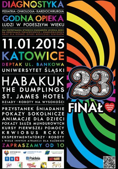 W Katowicach na deptaku przed rektoratem Uniwersytetu Śląskiego odbędzie się finał Wielkiej Orkiestry Świątecznej Pomocy (WOŚP) organizowany przez studentów UŚ. Tegoroczna edycja wydarzenia, która przebiega pod hasłem „Dla podtrzymania wysokich standardów leczenia dzieci na oddziałach pediatrycznych i onkologicznych oraz godnej opieki medycznej seniorów”, odbędzie się 11 stycznia 2015 roku.