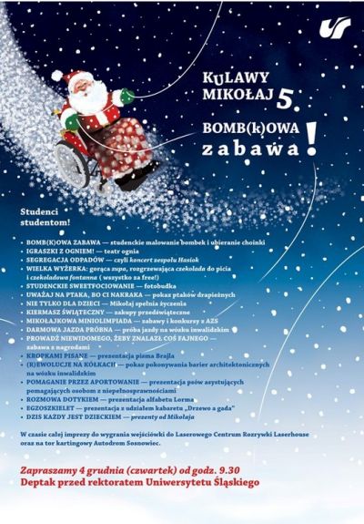 4 grudnia 2014 r. od godz. 9.30 do 14.00 na deptaku przed rektoratem Uniwersytetu Śląskiego trwać będzie piąta edycja akcji „Kulawy Mikołaj”, organizowanej przez studentów w ramach obchodów dwóch świąt Międzynarodowego Dnia Osób Niepełnosprawnych (3 grudnia) oraz Dnia Świętego Mikołaja (6 grudnia). To niezwykła akcja organizowana przez studentów dla studentów.
