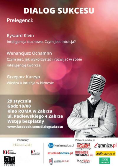 Organizatorzy zapraszają na kolejny Dialog Sukcesu czyli na projekt, który składa się z prelekcji i panelu dyskusyjnego już 29 stycznia 2015 r. o godzinie 18.00 do zabrzańskiego kina Roma (wstęp bezpłatny). Tym razem tematem przewodnim spotkania będzie... inteligencja.