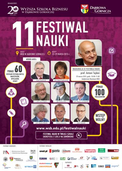 Dla miłośników nauki, pasjonatów podróży i aromatycznych kultur, obserwatorów gwiazd i poszukujących życia w kosmosie, zakorzenionych w tradycji i historii, literatów amatorów i dla wszystkich tych, dla których nauka jest czymś więcej niż tylko książkową wiedzą, organizowany jest już po raz 11 Festiwal Nauki w Dąbrowie Górniczej, której głównym organizatorem jest Wyższa Szkoła Biznesu w Dąbrowie Górniczej i Urząd Miejski w Dąbrowie Górniczej.