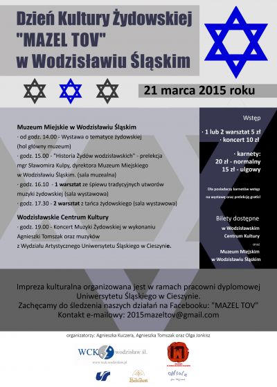 Impreza odbędzie się w sobotę 21 marca. Uczestnicy będą mogli wziąć udział w warsztatach ze śpiewu i tańca żydowskiego, prelekcji na temat "Historii Żydów wodzisławskich" oraz w koncercie w wykonaniu studentów Wydziału Artystycznego Uniwersytetu Śląskiego w Cieszynie. W tym dniu dodatkowo będzie można zobaczyć wystawę o tematyce żydowskiej w Muzeum Miejskim.